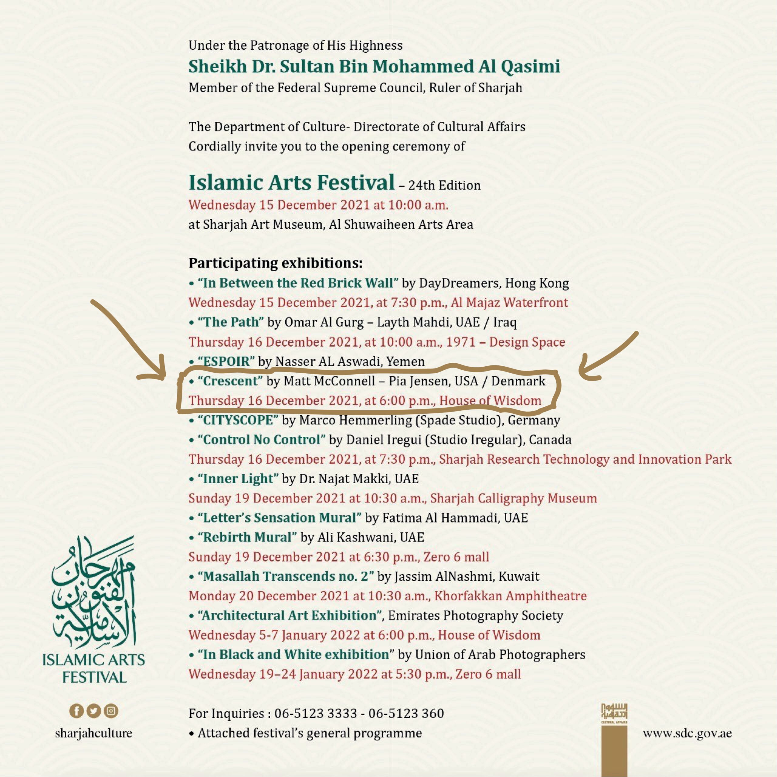 December 16, 2021, there is the opening of “Crescent” in the square in front of “House of Wisdom” – the newly built library and culture house in Sharjah.