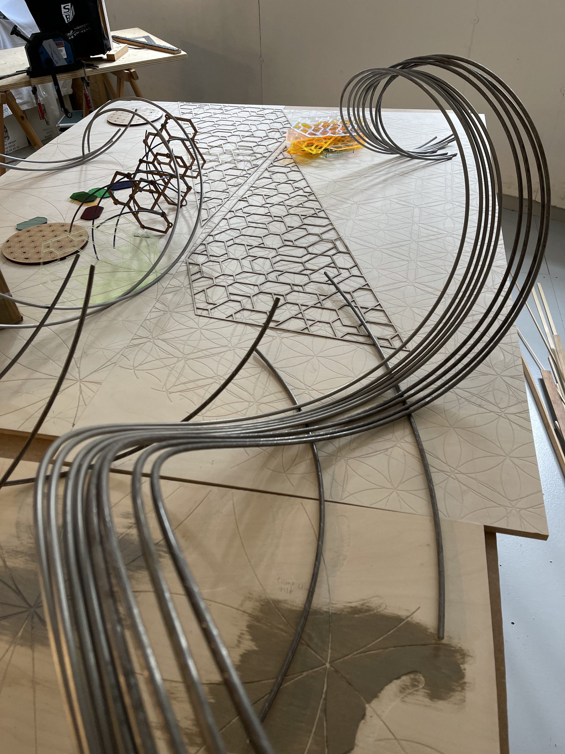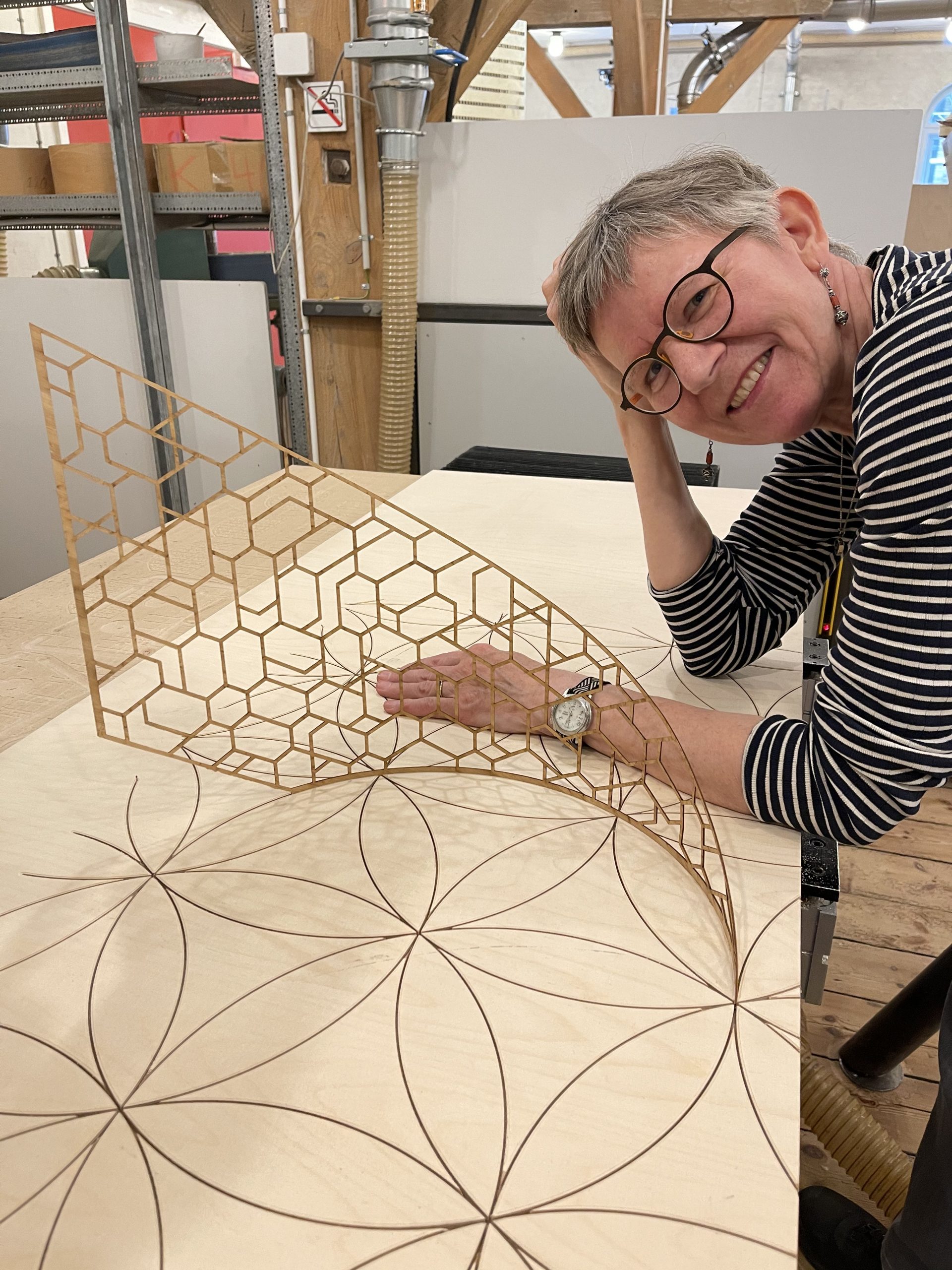 Kernen i vores samarbejde er et uendeligt mønster af cirkler, ofte beskrevet som hellig geometri – selv kalder jeg det cirklernes uendelige bund for Mauernes mønsterverden – som vi begge havde brugt som udgangspunkt for vores respektive værker til festivalen i UAE. Det er et grundlag, som i sig selv, blander sig og giver mulighed for at skabe nye niveauer til at skabe 3-dimensionelle former.